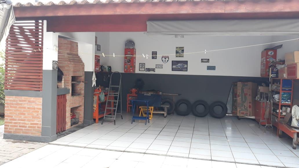 Sobrado com 2 dormitórios sendo 1 suíte com closed e sacada, banheiro, sala de estar, sala de jantar, lavabo, cozinha, lavanderia e garagem para 8 carros sendo 4 cobertas. Possui área gourmet com churrasqueira e forno de pizza.